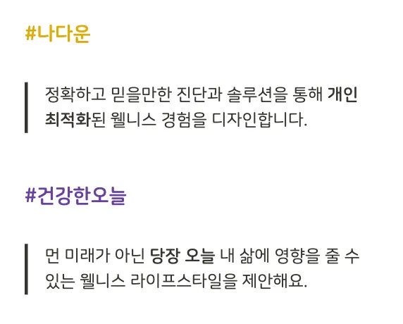 더 많은 사람들이 온전한 나의 모습을 마주하는 과정에서 조금 더 쉽게 건강한 선택권을 누릴 수 있도록 돕는 사용자 친화적 웰니스 서비스를 만들고 있어요.