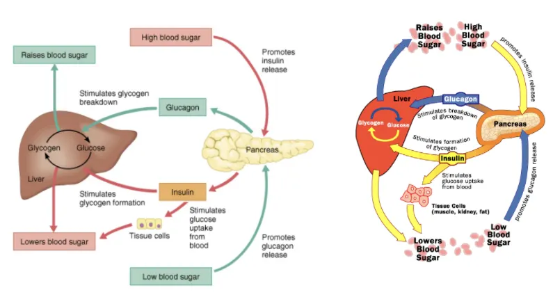 이렇듯 인슐린과 글루카곤은 마치 음양 작용처럼 서로 계속 피드백 루프로 작동하며 혈액 중 당이 일정 범위 이내로 유지되고 몸에 에너지가 안정적으로 공급되도록 도와줍니다.